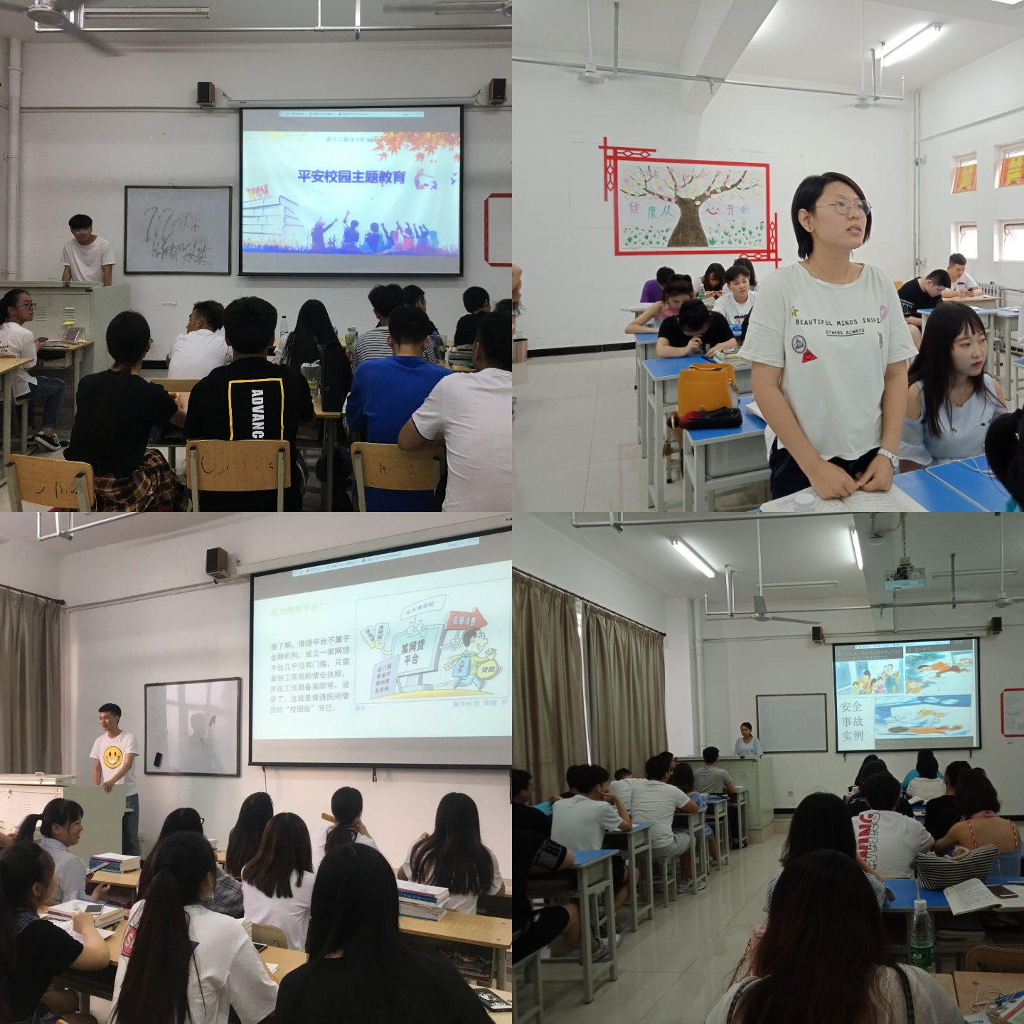 6月6日晚19点,会计二系2016级、2014级全体学生在班级教室内开展了创建“平安校园”主题团日班会活动。同学们从不同的视角,分析讨论了校园内潜在的安全问题和危机类型,并结合身边和网络上的典型事例提出了防范和应对危机的方法,通过深入的交流讨论,同学们提高了安全防范意识,增强了法制观念,积极的参与到“平安校园”的建设中来。