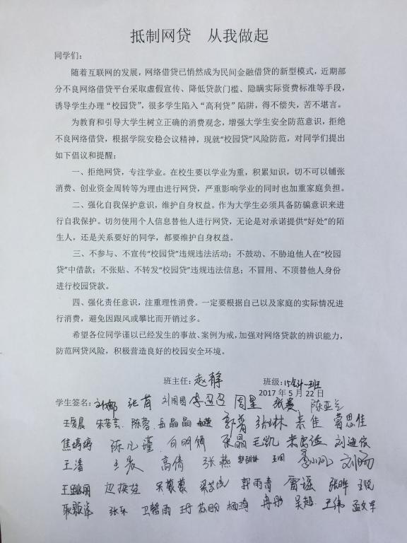 会后,各辅导员、班主任都第一时间召开了主题班会,将学生处下发的网贷案例在学生中进行了宣讲,阐明了其危害性与破坏性,同时在学生中进行了网贷筛查,确保不留死角,杜绝安全隐患。期间师生还共同签订了抵制“网贷”倡议书。