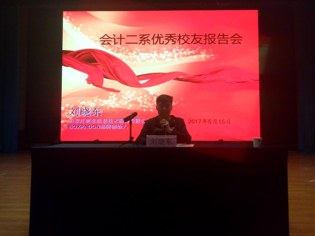 刘晓东是我院2013届电子商务专业毕业生,时任学生会主席,班长。在校期间就曾创造过大学生月入百万的商业奇迹。毕业后一直致力于自主创业。2015年创立石家庄派东信息技术服务有限公司任总经理,拥有两个自主知识产权的品牌,是京东、拼多多等电商巨擎的固定合作伙伴。