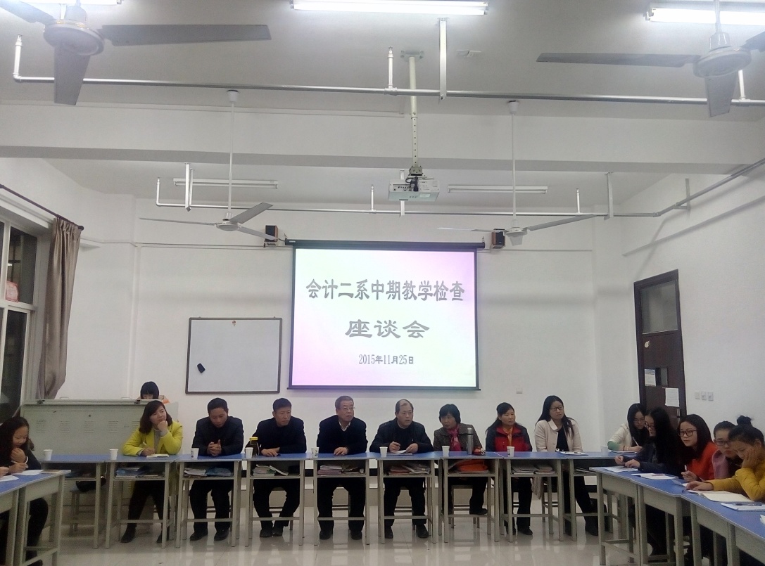 根据学院《关于开展2015—2016学年第一学期教学检查工作的通知》安排,2015年11月25日晚上7点半,会计二系在综合楼308教室召开中期教学检查学生教学座谈会。参加座谈会的有43个教学班学生代表与教学管理人员,会议由副主任曹耀辉主持。