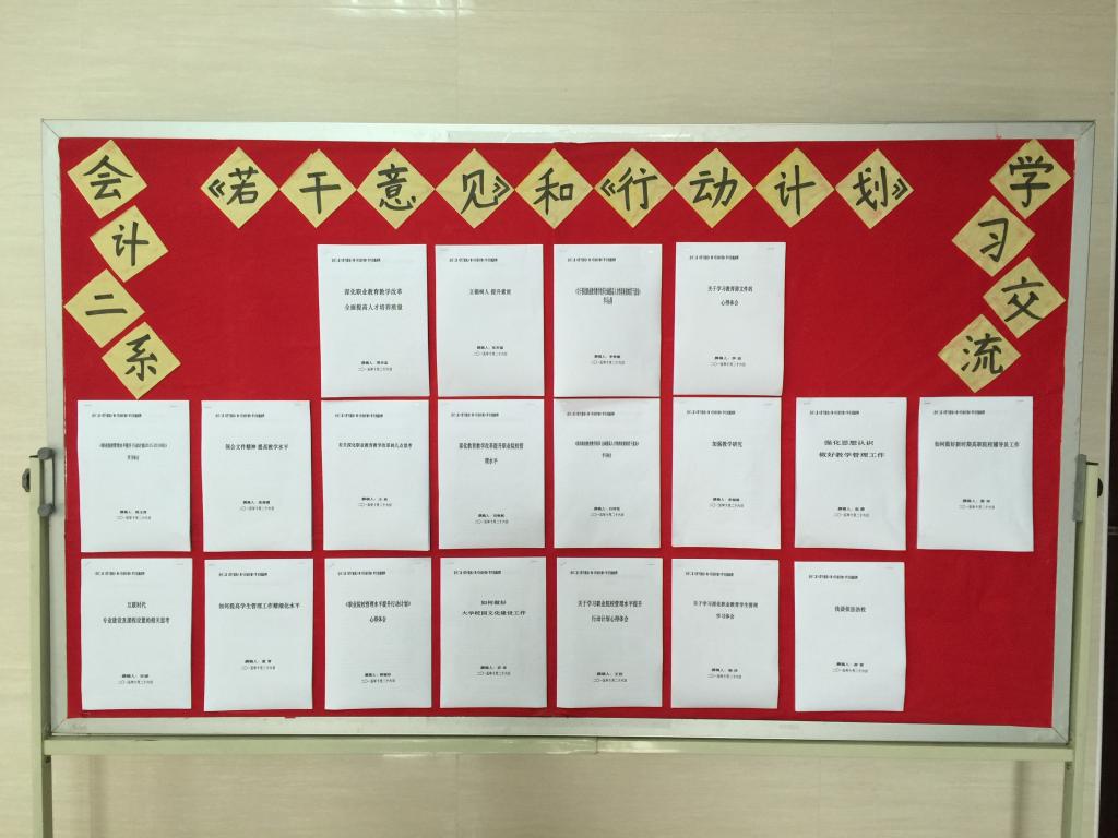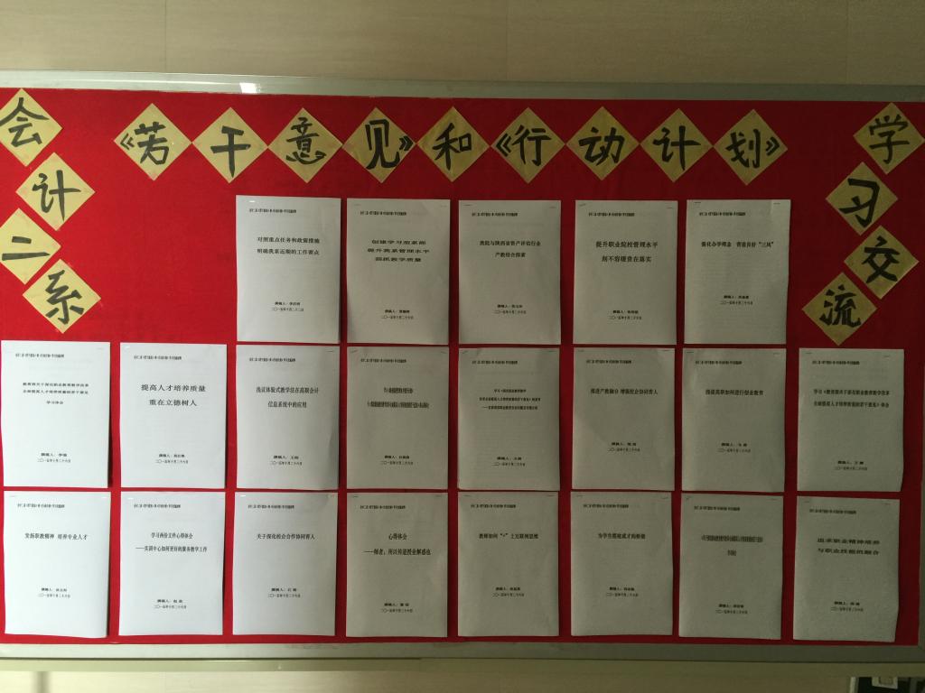 根据学院办公会议纪要精神,会计二系主任李启明先后在系总支学习会及教学例会上要求全体党员及教工在认真深入学习《教育部关于深化职业教育教学改革全面提高人才培养质量的若干意见》和《职业院校管理水平提升行动计划(2015-2018年)》两个文件后,提交心得体会并制作学习交流展板。
