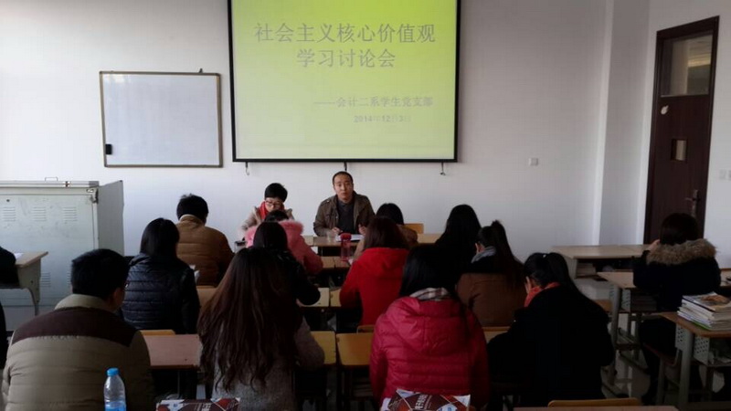 | 为正确引导学生党员牢固树立社会主义核心价值观,全面提高广大青年学生党员的政治水平与思想素质。2014年12月3日下午4时,会计二系学生党支部全体教工党员与学生党员在综合楼322教室召开了“社会主义核心价值观”的学习讨论会,会议由系专职副书记乔晶策主持。 首先由会计二系学生党支部组织委员赵静从“培育和践行社会主义核心价值观的意义、社会主义核心价值观的内涵、如何培育和践行社会主义核心价值观”这三个方面进行了深入的政策学习与解读。价值观是人们心中的深层信念,是非判断的标准,行动遵循的准则。“24字社会主义核心价值观”,充分体现了历史传承与时代发展的高度统一。因为它源于中华传统文化的丰土沃壤和厚重根基,具有强烈的中国特色、中国气派、中国根脉,它是对中华民族几千年发展中所形成的“礼义仁智信”、“和为贵”、“和而不同”、爱国主义等优秀传统价值理念和道德规范的高度概括和升华。 其次,学生党员们在热烈的学习氛围中展开了讨论,学生党员周恒波说“培育和践行社会主义核心价值观,是从日常学习生活的点滴做起。读书好学、与人为善、知文明讲礼仪,这些都是我们大学生践行社会主义核心价值观的具体体现。”学生党员李欣妍说“作为一名青年大学生,应当自觉践行社会主义核心价值观。自信与勇气并存,要有不怕失败,敢于担当的气魄。” 最后,系专职副书记乔晶策传达了院组织处《关于学院中共预备党员发展及转正有关事项的规定》文件精神,并和党员同志们一道学习了中共中央5月印发的《中国共产党发展党员工作细则》,对今后学生党员发展工作提出新的要求与安排。他要求学生党员要深入贯彻习近平总书记的讲话精神与社会主义核心价值观的内涵,要充分发挥学生党员的战斗堡垒作用,在学习、工作、生活中要率先垂范,发挥模范带头作用,要坚定理想信念,做优秀共产党员。 (图片:周恒波核稿:乔晶策)