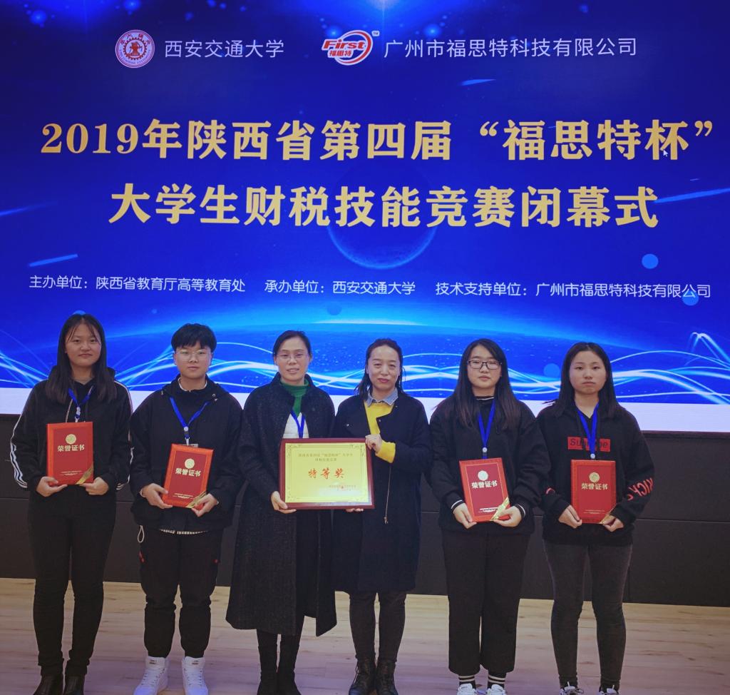 陕西省第四届“福思特杯”大学生财税技能竞赛于2019年10月26日,在西安交通大学兴庆校区隆重举行,用友·新道会计学院朱红霞和林琳老师带领学生梁娜娜、全诗锐、田鸿玉和张欣艳,代表我校参赛并荣获特等奖。