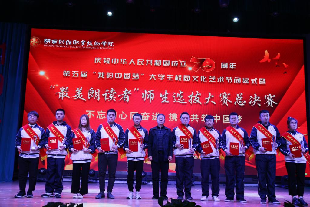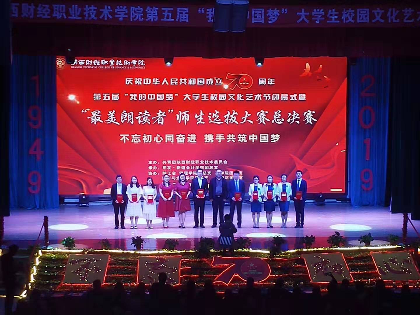 经过评委专业细致地评审,最终,作品《我的南方和北方》荣获一等奖,作品《周恩来》《不忘初心 牢记使命》《活埋》荣获二等奖,《丝路赞歌》《庆华诞数70载国逢盛世》《 我和我的祖国 》《中国梦》荣获三等奖,用友·新道会计学院院长李启明为获奖选手颁奖并合影留念。教工组11位参赛选手均获得陕西财经职业技术学院“最美朗读者”荣誉称号,工会主席王爱军为获奖教职工颁奖并合影留念。