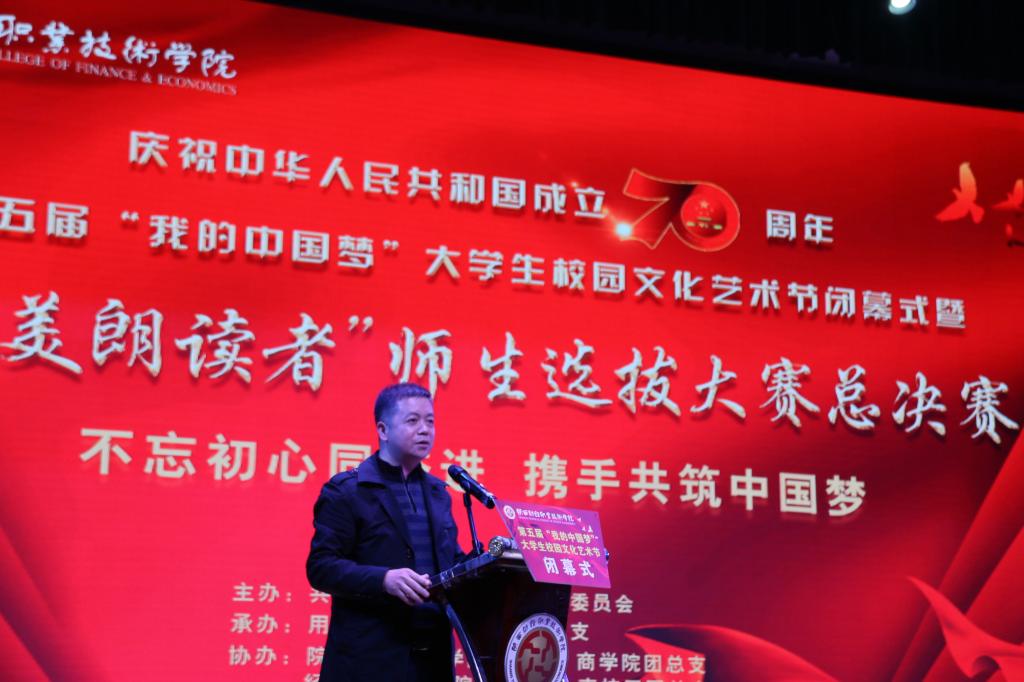 10月30日下午,我院庆祝中华人民共和国成立70周年第五届“我的中国梦”大学生校园文化艺术节闭幕式暨“最美朗读者”师生选拔大赛总决赛在学院大礼堂成功举办。学院党委副书记朱华斌出席活动,相关处室院部负责人、用友·新道会计学院全体教职工以及其他二级学院师生约1400余人参加活动。人文艺术学院执行院长崔斗、团委书记窦曼娟、党委组织部副部长张洁、人文艺术学院语文艺术教研室副主任马晶照、团委干事贺华担任本次大赛评委。