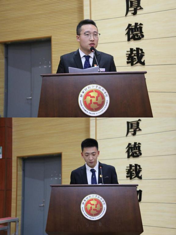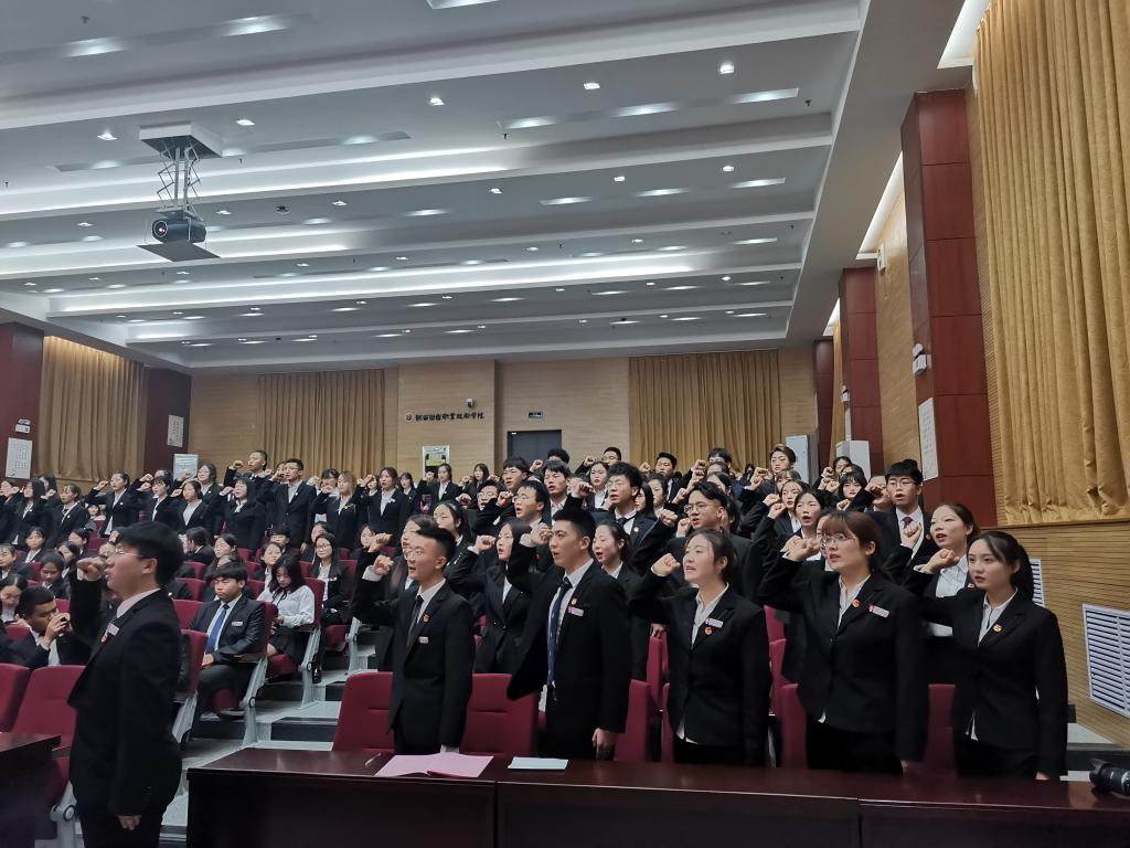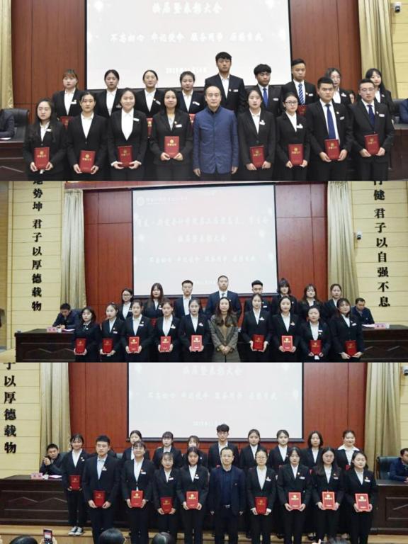 大会在用友·新道会计学院两届学生干部共同录制的视频《以梦为马,不负韶华》中拉开帷幕。十多分钟的视频,呈现着他们一年来的工作成绩,诠释着学生干部的初心与使命,也寄托着他们对母校师生的不舍与祝福。首届学生会主席辛季蓬对上一学年学生会工作做了总结发言,点滴回忆,些许故事,句句深情,字字不舍,让现场的师生潸然泪下。随后,窦曼娟宣读了《关于表彰用友·新道会计学院2018-2019学年“优秀学生干部”的决定》,乔晶策、窦曼娟、贺适分别为优秀学生干部颁发荣誉证书;贺适宣读了《关于用友·新道会计学院第二届团总支、学生会干部的任命决定》,乔乐、赵静、唐齐、张璐、王小翠、师丽珍分别为新聘任的学生干部颁发聘书。紧接着,用友·新道会计学院第二届学生会主席张政同学代表新一届学生干部做了表态发言,首届学生会主席团干部们给第二届主席团干部们佩戴胸牌,让责任传递,将使命传承。学生会副主席蒲宁欣领誓第二届全体学生干部做了庄严的入会宣誓,“不忘初心、牢记使命,服务同学、历练自我!”的誓言响彻了整个报告厅。