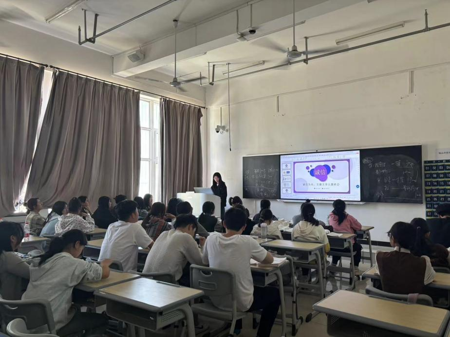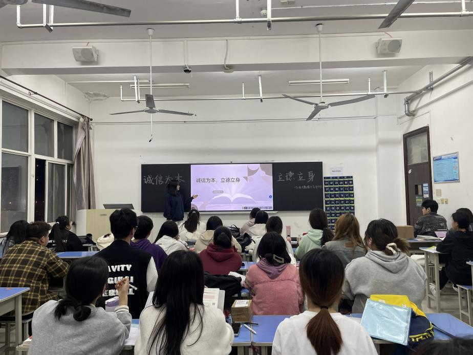 班会以诚信的含义开场,各班主持人从不同角度解读诚信二字。随后,主持人带同学们学习了有关诚信的典故,如商鞅立木为信、曾子杀猪,让同学们懂得了懂得诚实守信是中华民族的传统美德;其次,同学们列举身边的各种诚信案例,纷纷表示要以他们为榜样,争做新时代诚信好青年;最后,辅导员讲解了防范诈骗的相关知识,提醒同学们强化防骗意识,提高甄别能力。
