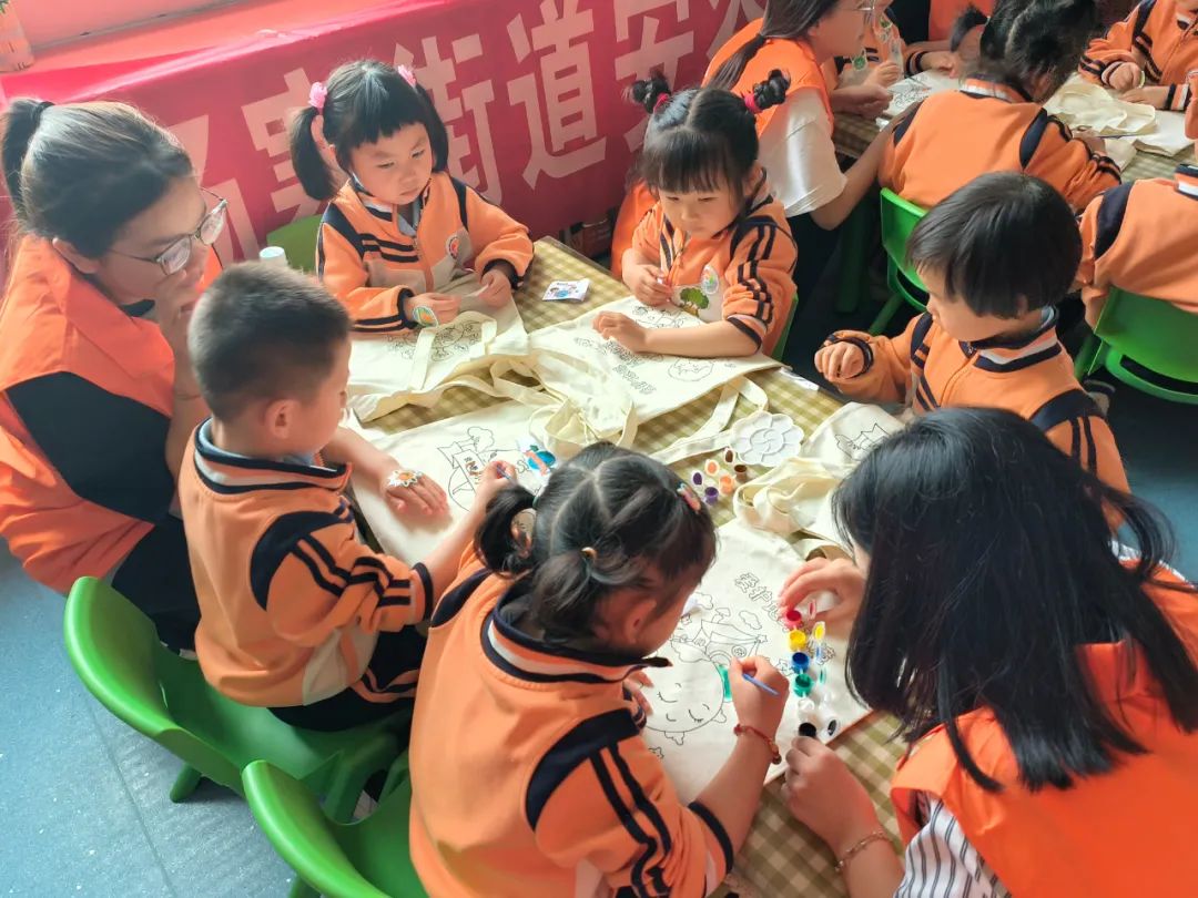随后,志愿者们引导小朋友们参与布袋绘画活动。小朋友们在志愿者的协助下,发挥自己的想象力,用小小的画笔左一下右一下描绘着自己心中的美好世界。在大家的共同努力下,最终完成了“手工环保布袋”。