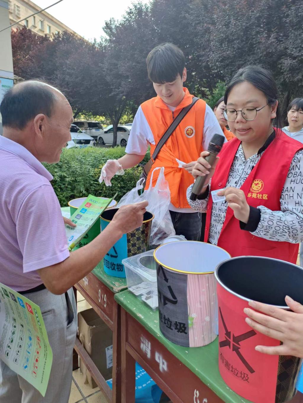 在紧张刺激的问答过程中,“先锋橙”志愿者为居民们提供了现场指导和帮助。与此同时,“先锋橙”志愿者向社区居民发放宣传单页,给社区居民讲解垃圾分类相关知识。志愿者们还为回答上问题的居民分发粽子,并希望他们能将垃圾分类知识应用到日常生活中。
