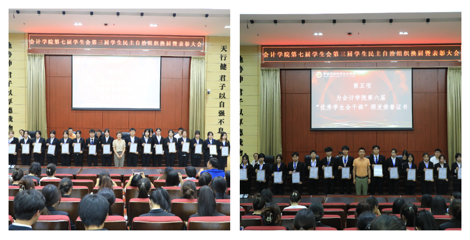 随后,刘歆语宣读了《关于表彰会计学院第六届“优秀学生会干部”的决定》,张璐为“优秀学生会干部”颁发了荣誉证书;李飞宣读了《关于表彰会计学院第二届学生民主自治组织“优秀学生干部”的决定》,赵静为学生民主自治组织“优秀学生干部”颁发了荣誉证书。张璐宣读了《关于会计学院第七届学生会干部及第三届学生民主自治组织学生干部的任命决定》,贺适为学生干部授予工作牌。