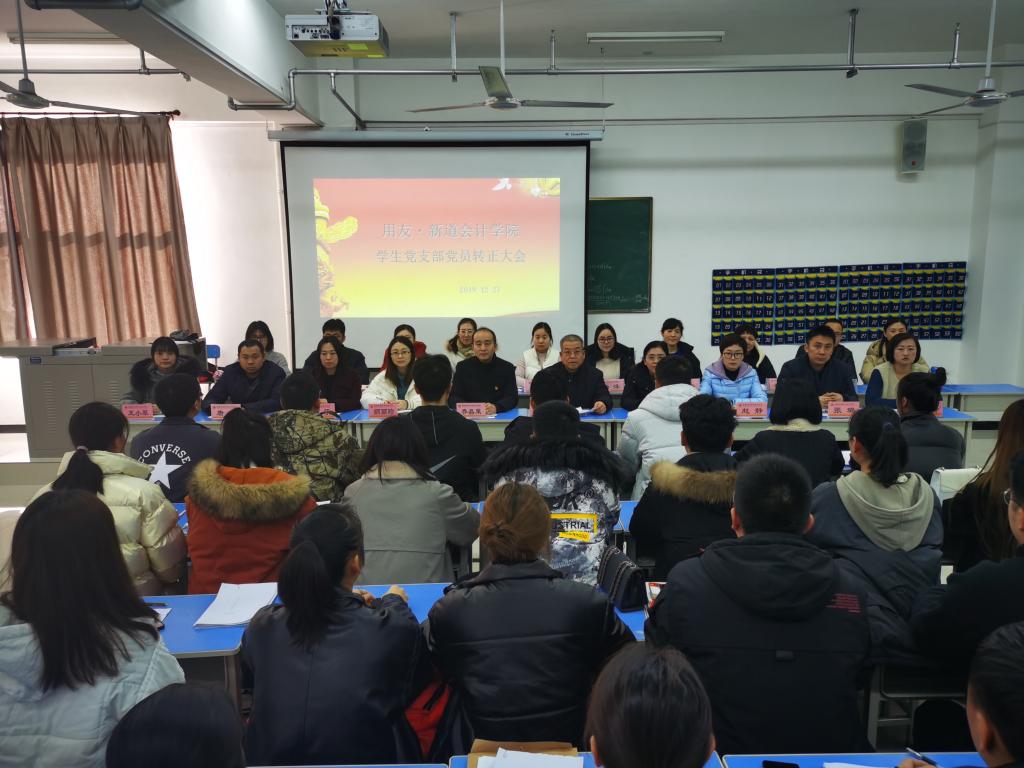 2019年12月27日下午2时30分,用友·新道会计学院学生党支部在综合楼425教室召开了2019年下半年学生党员转正大会。参加本次会议的有用友·新道会计学院党总支书记乔晶策、党总支副书记李启明、党总支副书记缑宇英以及所有入党介绍人。会议由学生第二党支部书记师丽珍主持。