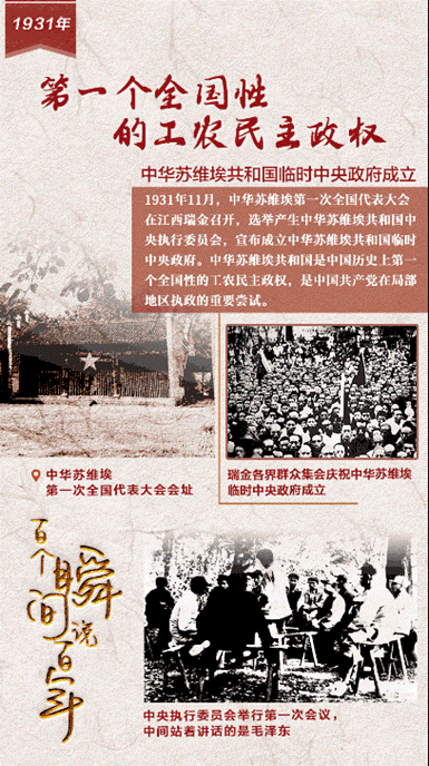 在各根据地和红军不断发展的形势下,1931年11月,中华苏维埃第一次全国代表大会在江西瑞金召开,来自闽西、赣东北、湘赣、湘鄂西、琼崖、中央等根据地,红军部队,以及在国民党统治区的全国总工会、全国海员总工会的610名代表出席了大会,选举产生中华苏维埃共和国中央执行委员会,宣布成立中华苏维埃共和国临时中央政府。毛泽东当选为中央执行委员会主席和中央执行委员会人民委员会主席。