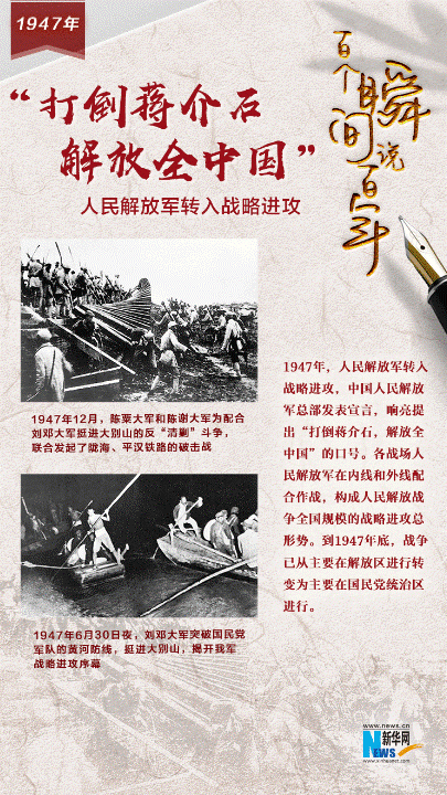 1947年6月30日夜,刘伯承、邓小平率领晋冀鲁豫野战军主力12万人一举突破黄河天险,揭开了战略进攻的序幕。刘邓大军千里跃进,于8月末进入大别山区,粉碎国民党军队的重点轮番进攻,到11月共歼敌3万余人,建立33个县的民主政权。