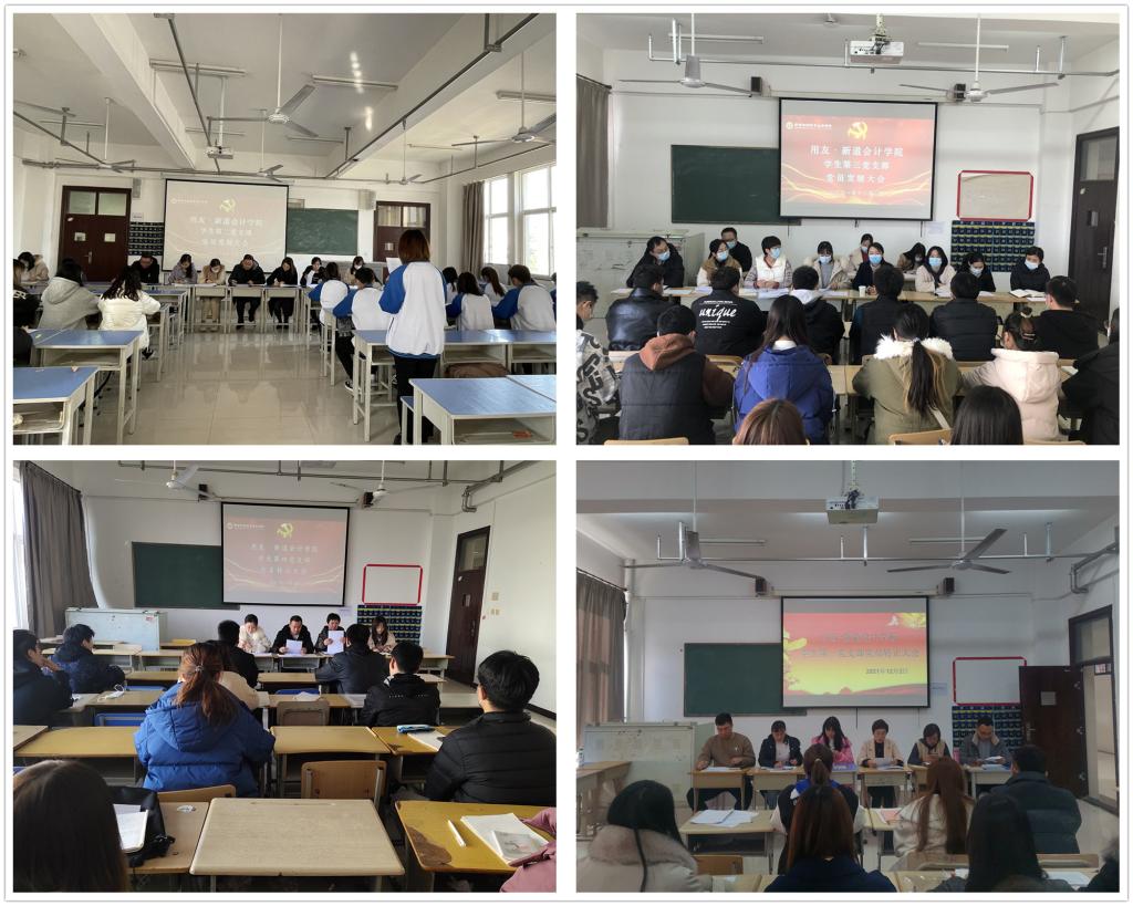 2021年12月2日,用友·新道会计学院6个学生党支部分别在综合楼召开了2021年下半年学生党员发展和转正大会。学院党委组织部副部长张洁、组织科副科长师丽珍、干事曹敏姿分别列席会议并进行了督查指导。会议由各学生支部书记主持。