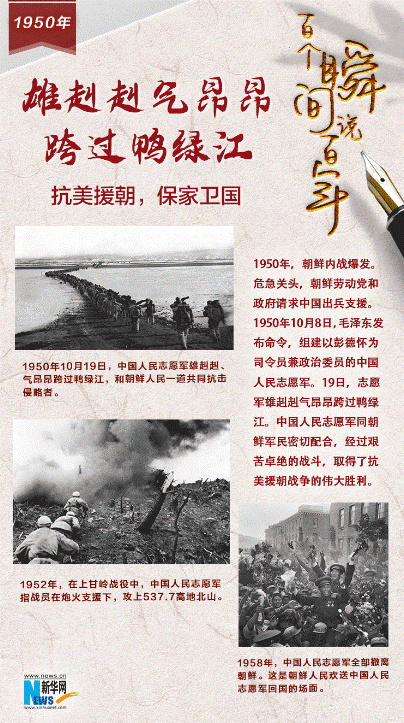 1950年10月8日,毛泽东发布命令,组建以彭德怀为司令员兼政治委员的中国人民志愿军。19日,志愿军雄赳赳气昂昂跨过鸭绿江。这是以正义之师行正义之举。中国人民志愿军同朝鲜军民密切配合,首战两水洞、激战云山城,会战清川江、鏖战长津湖等,此后又构筑起铜墙铁壁般的纵深防御阵地,实施多次进攻战役,粉碎“绞杀战”、抵御“细菌战”、血战上甘岭,创造了威武雄壮的战争伟业。