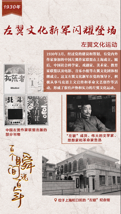 1930年3月,经过中国共产党的建议和筹划,有党内外作家参加的中国左翼作家联盟(简称左联)在上海成立。随后,中国社会科学家、戏剧家、美术家、教育家联盟以及电影、音乐小组等左翼文化团体也相继成立。这支左翼文化新军在党的领导下,积极从事马克思主义宣传和革命文艺创作等活动,形成了很有声势和实力的左翼文化运动。
