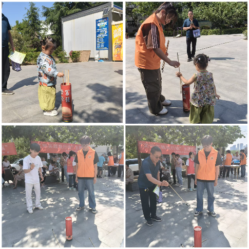 活动伊始,志愿者们在社区工作人员的带领下走进社区,摆放好活动需要的物品。“投五毒”的游戏吸引了居民们的目光,大家手持箭矢,瞄准壶口奋力一投,每次投中一次都引来阵阵掌声和欢呼,大家不仅收获到了快乐,还体会到了端午驱邪祈福的传统寓意。在投中次数最多的居民还获得了志愿者们为其准备的奖品。