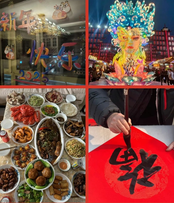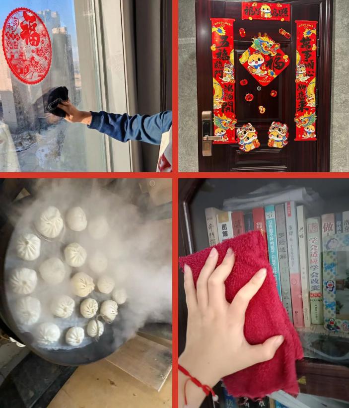 同学们纷纷化身"新春焕新官",用镜头定格家庭扫尘迎新的生动场景:擦净的玻璃映照出窗外的红灯笼,整齐的书架陈列着崭新的书籍,油亮的灶台飘散着年饭的香气,更有春联福字点缀的门庭、被褥衣物晾晒的暖阳……每一帧画面都承载着对家的热爱与对生活的热忱。