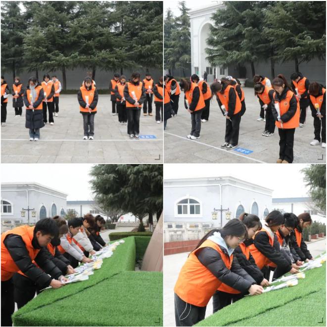 祭扫仪式在庄严的国歌声中拉开帷幕,全体志愿者肃立,向伟大的革命烈士深深三鞠躬,默哀三分钟,深切表达对革命先烈的追思,以及对他们不朽精神的崇高敬意。随后,在纪念碑前,志愿者们整齐列队,向革命先烈们敬献花束,洁白的花朵寄托着无尽的缅怀与感恩,象征着他们不朽的功绩与崇高的精神。
