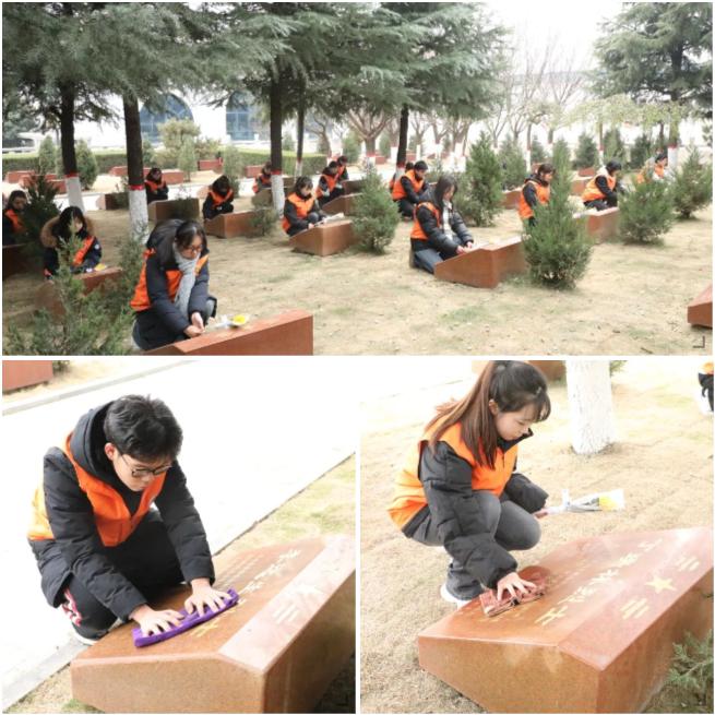 接着,我院学子依次上前为烈士墓擦拭墓碑,以实际行动表达对革命先烈的崇高敬意和无限哀思。每一块墓碑都是一个英勇生命的见证,每一行文字都承载着一段不朽的传奇。志愿者们一边擦拭着墓碑,一边仔细阅读着这些文字,眼神中透露出对先烈的深深敬仰和无尽怀念。