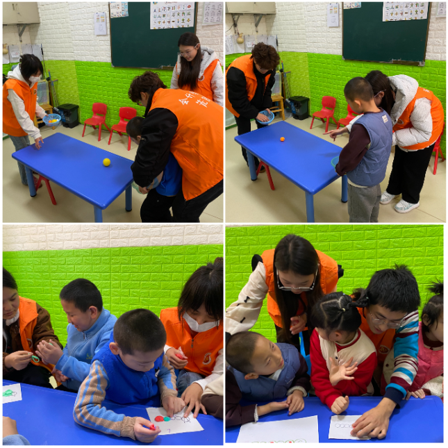 接着,志愿者带领小朋友依次开展了“杯子接球”游戏和“精细手工”制作,这两个游戏不仅锻炼了孩子们的肢体协调与平衡能力,增强身体控制能力而且还培养了空间认知和手部精细动作能力,提升了耐心与专注力。无论是杯子接球的轮流参与,还是精细手工时的合作,都为孩子创造了互动交流机会,有助于他们提高社交技能,增强自信,更好地融入集体和社会。