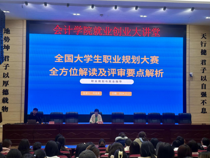为贯彻落实党中央、国务院决策部署,落实《国务院关于印发“十四五”就业促进规划的通知》精神,促进会计学院学生生涯规划教育和就业指导,助力学生深入洞悉全国大学生职业生涯规划大赛规则,熟练掌握备赛策略,提升比赛竞争力,会计学院于12月3日下午在学术报告厅举办了第二届全国大学生职业生涯规划大赛全方位解读及评审要点解析讲座,会计学院部分党员、团员代表以及“一站式”学生社区尚德书院学生代表共300余人参加本次讲座。此次讲座特邀请到陕西省人社厅特聘创业专家导师刘龙泉担任主讲人,讲座由会计学院学生管理科科长赵静主持。