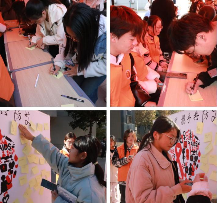与此同时,便利贴留言区温馨满满,创意无限。同学们纷纷挥毫泼墨,在色彩斑斓的便利贴上,写下对艾滋病患者的温暖鼓励、对防艾事业的坚定信念及参与活动的深切感悟。“愿爱如阳光,驱散歧视阴霾,温暖艾滋病患者心田”“从我做起,从小事做起,携手并进,共筑防艾长城”等留言,字字珠玑,句句深情,不仅彰显出同学们对艾滋病患者的深切同情与深切关怀,更展现了他们积极参与防艾宣传、共建和谐健康校园的坚定决心。一张张便利贴,宛如爱的使者,在微风中轻轻摇曳,汇聚成一片爱与希望的璀璨星河。