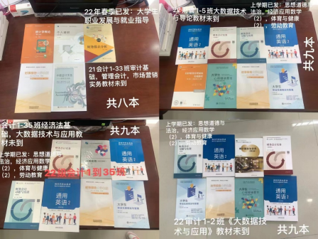 教学科赵文红统筹安排教材发放准备工作。2月4日,赵文红老师提前联系教务处领取教师用书并发放,方便教师备课,2月10日,为确保学生正确领取教材,赵文红老师提前拍摄教材照片,指导各班学委做到心中有数,方便清点教材。2月11日,赵文红协调学管各班辅导员按时间表安排有序发放我院92个班级的教材。