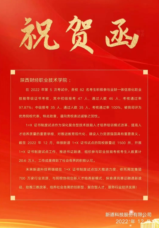 12月3日,由新道科技股份有限公司主办的2022年全国“1+X”业财一体信息化应用职业技能等级证书(初级/中级)考试在我院顺利举行,来自我院大数据与会计、大数据与财务管理等不同专业的82名考生积极参与了此次考试,其中,47名学生报考初级考试,通过人数46名,通过率98.78%;35名学生报考中级考试,通过人数35名,通过率达100%。日前接到新道科技股份有限公司发来的喜报,我校被评为优秀院校代表。