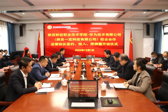 2022年12月1日下午,我校与华为技术有限公司(陕西一览科技有限公司)在学校办公楼四楼会议室举行华为ICT会计产业学院校企合作运营协议签约、投入、授牌暨2022级智慧财经卓越班开班仪式。我校党委书记张志华、院长程书强出席,华为技术有限公司陕西政企教育医疗总经理郭程、行业总监李涛、陕西一览科技有限公司总经理王玉民、副总经理李宝宇等一行7人出席会议。我院教务处处长刘军、会计学院院长常茹、书记贺适等相关部门领导及产业学院管理教师和学生代表参加会议。会议由教务处处长刘军主持。