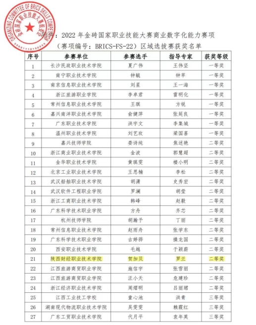 9月29日,2022年金砖国家职业技能大赛商业数字化能力赛项区域选拔赛成功举行。此次大赛由中华人民共和国教育部、中华人民共和国人力资源和社会保障部、金砖国家工商理事会、厦口市人民政府主办,由中国教育国际交流协会、教育部职业教育发展中心、金砖国家工商理事会技能发展工作组承办,来自全国各地百余所院校的师生参加了本次区域选拔赛,竞选参加国际赛的资格,我校会计学院教师贺加贝、指导教师罗兰在本次区域选拔赛中喜获二等奖。