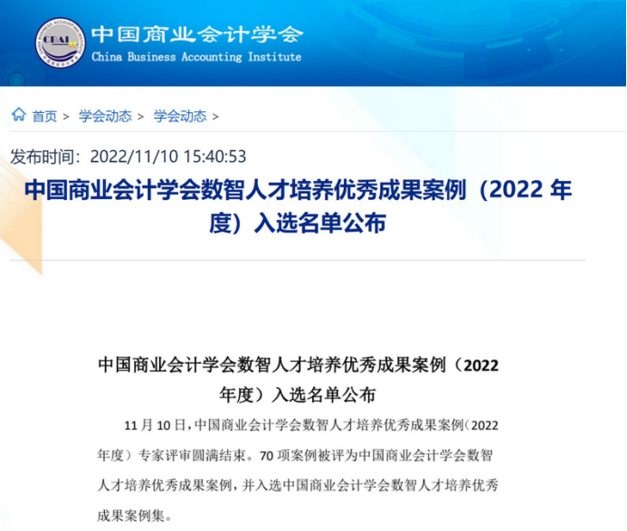 2022年11月10日,中国商业会计学会数智人才培养优秀成果案例(2022年度)专家评审圆满结束,由我校会计学院撰写的《校企深度合作,共育数智时代下新财会人才》一文,入选“中国商业会计学会数智人才培养优秀成果案例集”。