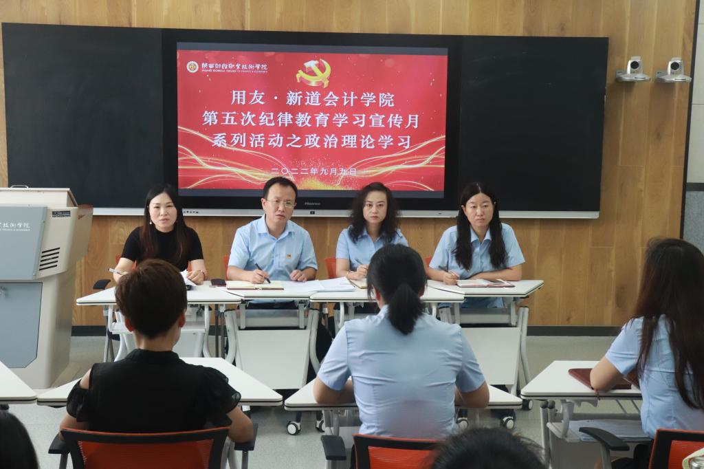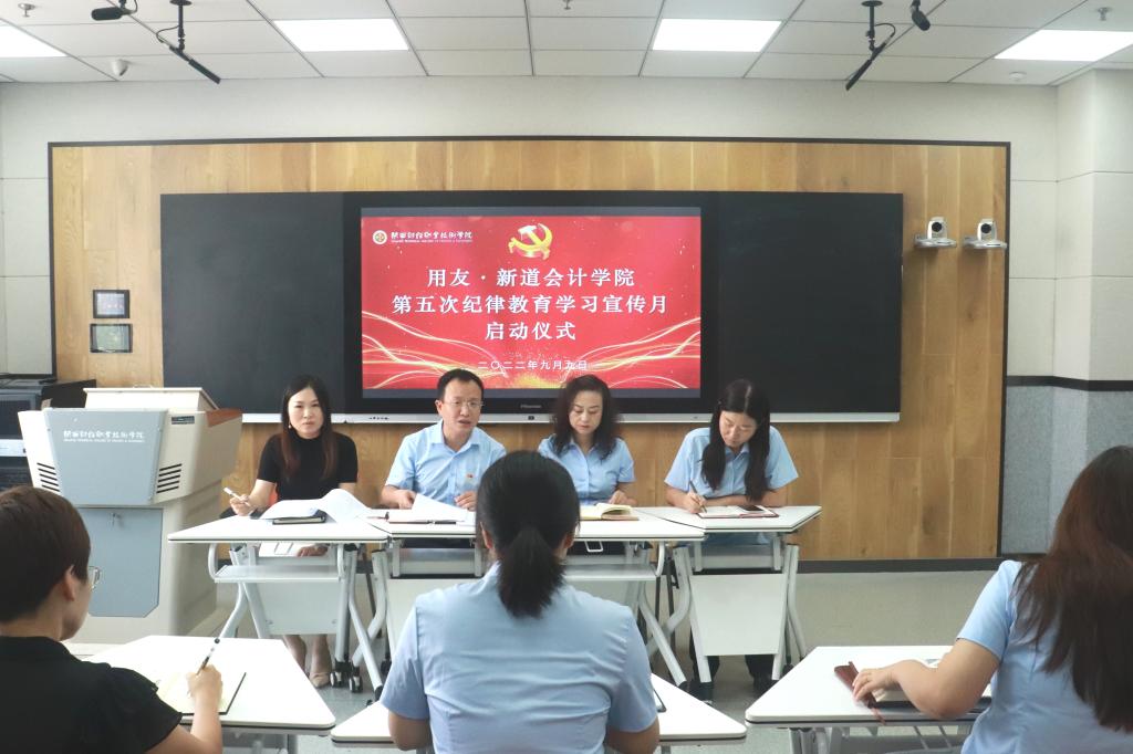 9月9日上午11:20,用友·新道会计学院在教学楼414智慧教室举办了第五次纪律教育学习宣传月活动启动仪式。我院党总支书记贺适、院长常茹、党总支副书记兼副院长刘艳妮、党总支专职副书记李妙娟出席会议,各支部书记、教师代表共计30余人参加会议。会议由李妙娟主持。