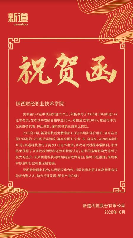 10月24日下午14:00-16:30,由新道科技股份有限公司主办的2020年全国“1+X”业财一体信息化应用(中级)考试在我院顺利举行。我院喜获佳绩,考核通过率为100%。