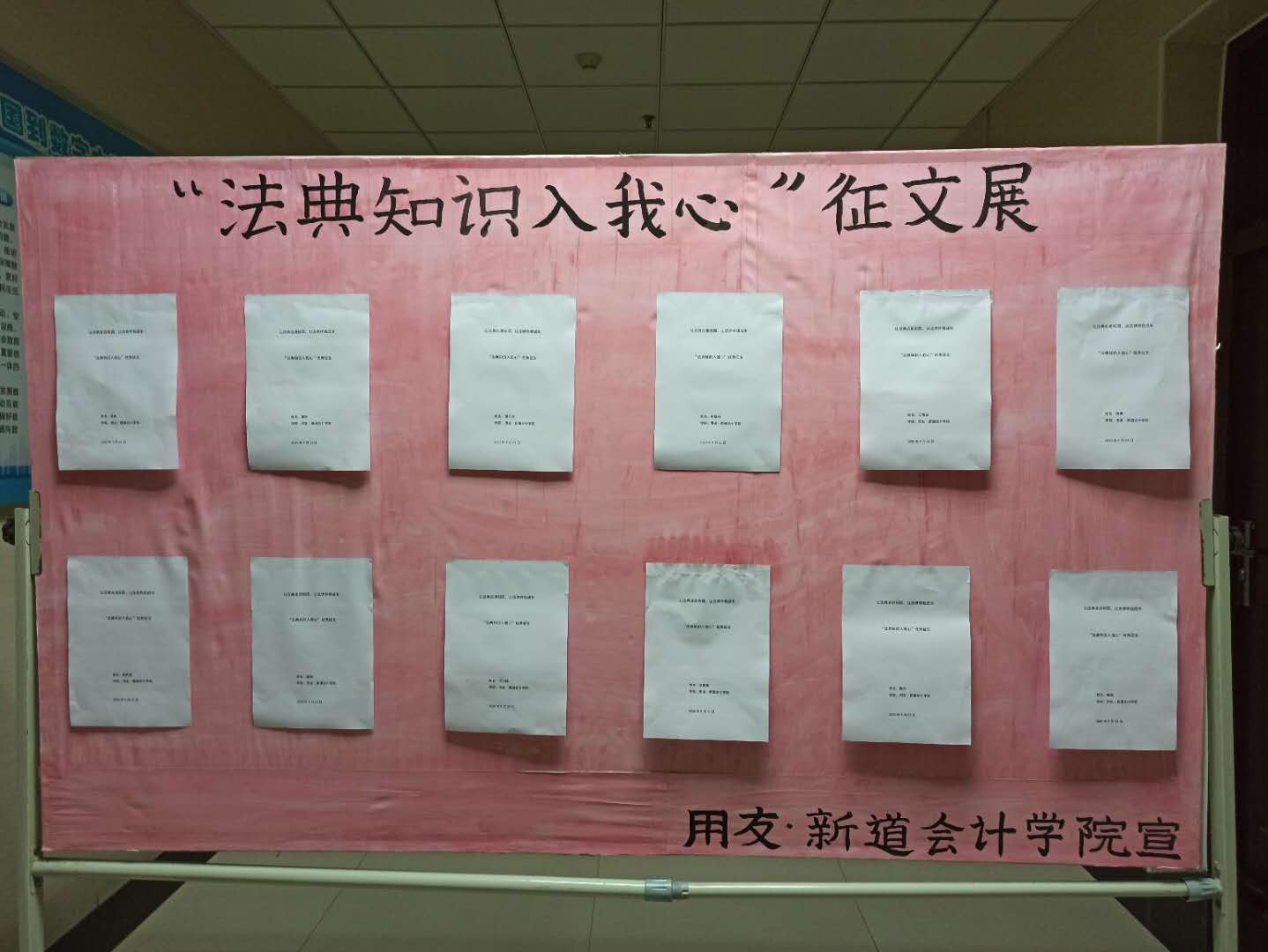 为贯彻落实中共陕西省委普法工作领导小组办公室、陕西省教育厅、陕西省司法厅关于秋季开学期间组织开展“民法典进学校”等活动的通知精神,切实加强学院师生对民法典的学习宣传教育,营造尊法、学法、守法、用法的良好校园文化氛围,由团委和用友·新道会计学院开展“让法典走进校园,让法律伴我成长”--“民法典进学校”主题系列活动。