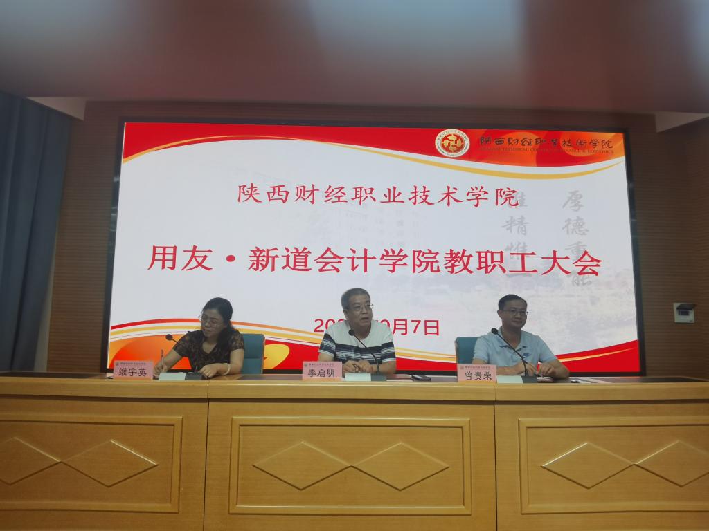 2020年9月7日下午4点30分,用友·新道会计学院在学校继续教育培训厅召开了学院教职工大会,这是学校院系调整后新的用友·新道会计学院召开的第一次大会,也是新学期的第一次教职工大会。会议由副院长缑宇英主持。