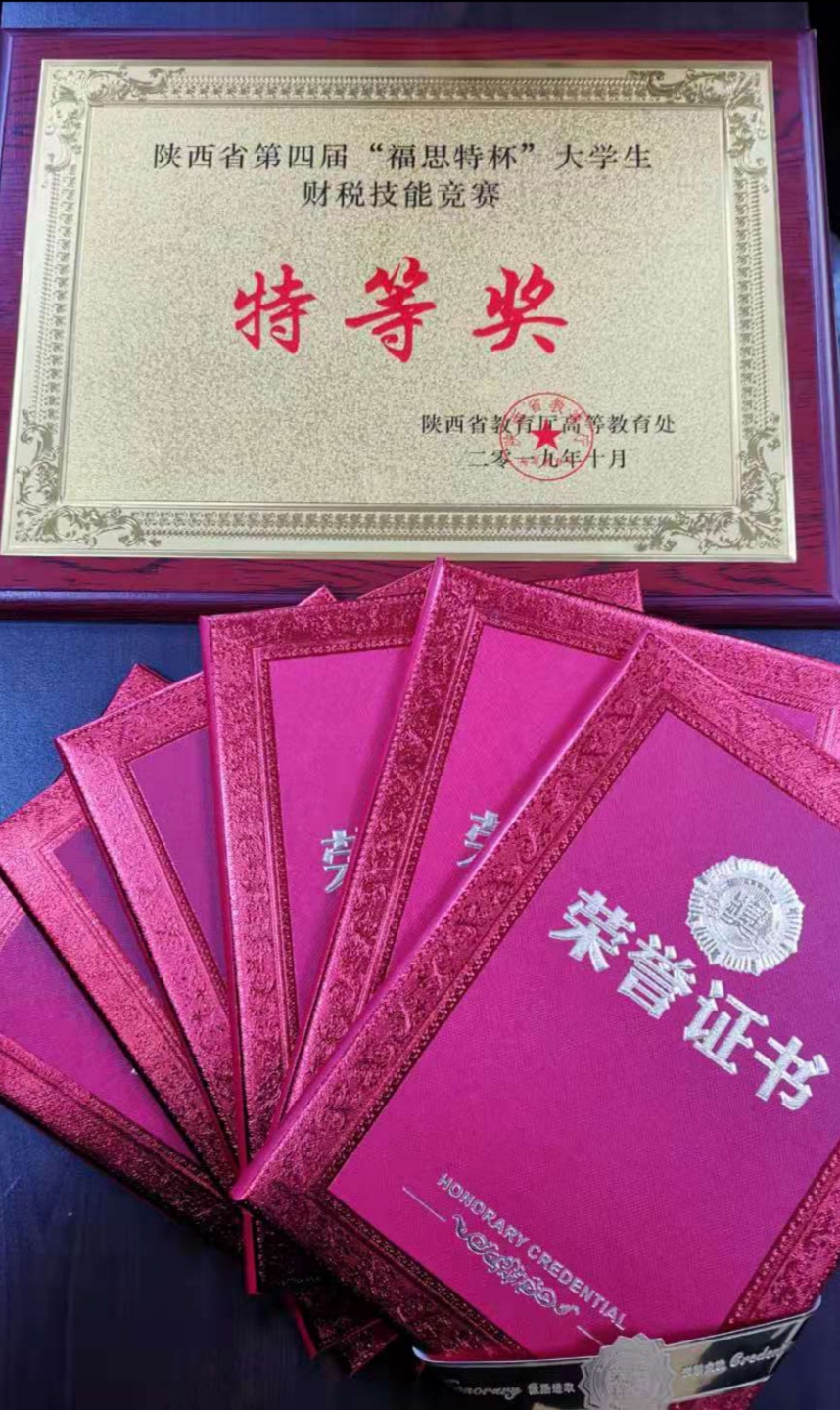 陕西省第四届“福思特杯”大学生财税技能竞赛于2019年10月26日,在西安交通大学兴庆校区隆重举行,用友·新道会计学院朱红霞和林琳老师带领学生梁娜娜、全诗锐、田鸿玉和张欣艳,代表我校参赛并荣获特等奖。