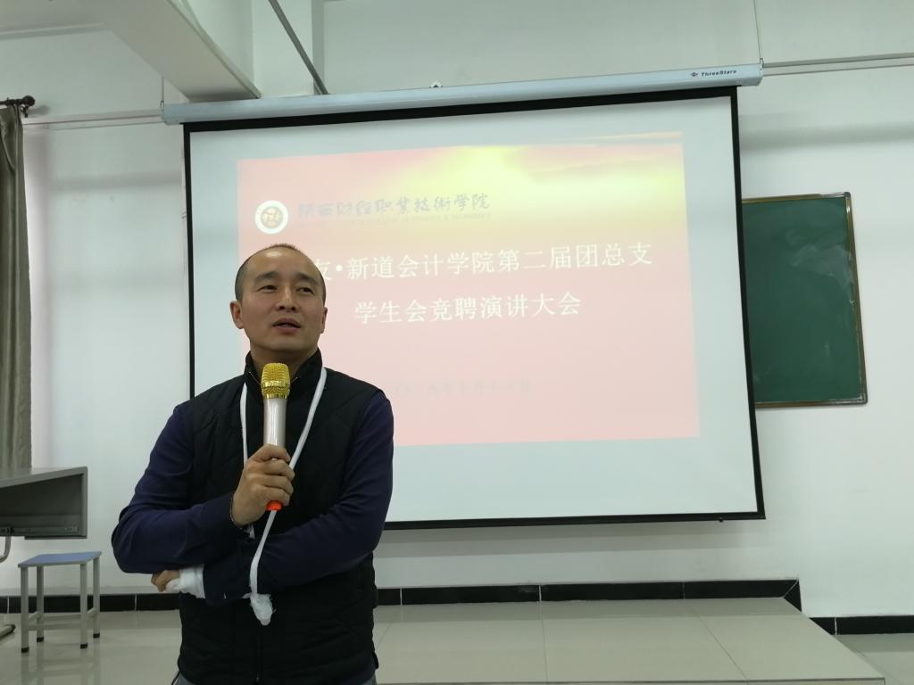 2019年10月11日下午2点,用友.新道会计学院在425合班教室举办了用友.新道会计学院第二届团总支、学生会竞聘演讲大会。用友.新道会计学院党总支书记乔晶策及13名辅导员出席并担任评委。100余名新人学生干部参加了本次竞聘演讲。