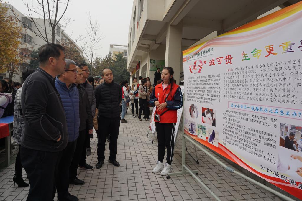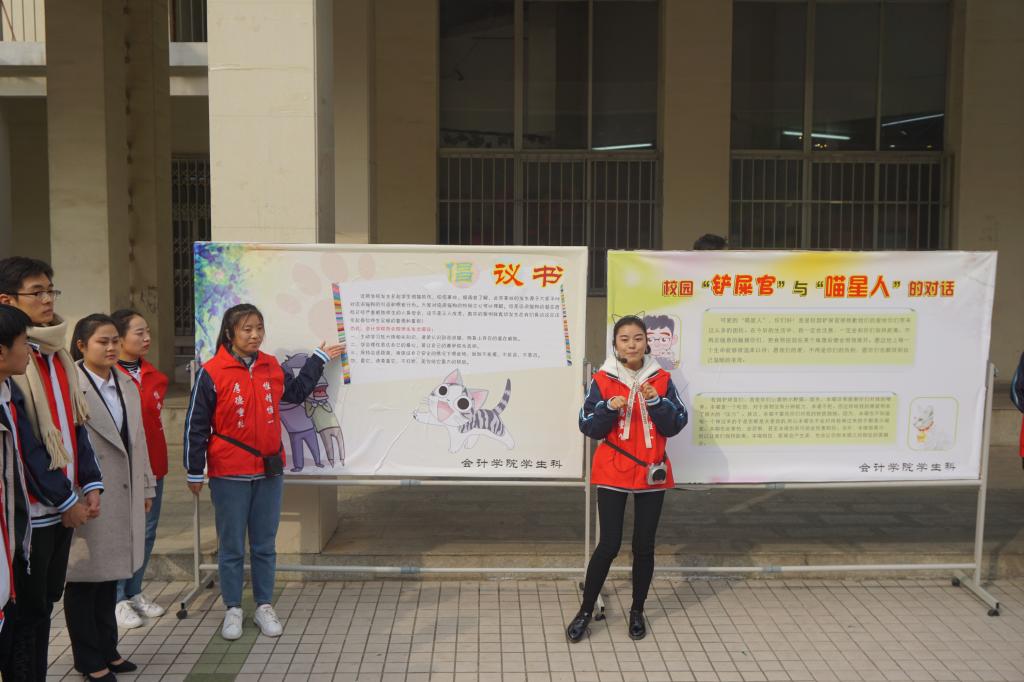 针对近期学院发生多起学生被流浪猫抓伤、咬伤事件,此次活动旨在呼吁全院师生理性关爱动物,注重自身安全。首先,由会计学院学生会干部组成讲解队,为各位参与活动的领导、老师和同学们讲解“狂犬病”、“猫抓热”等相关知识,以我院学生被猫抓伤的真实事件为例,讲解被猫狗抓伤后正确的应急处理措施。随后,由学生扮演的“校园铲屎官”与“喵星人”对话的小情景剧,生动形象地展示出“狂犬病”、“猫爪热”的危害性与可能造成的严重后果。活动进行过程中,会计学院学生会网络传媒中心组成记者团对参与活动的同学穿插进行采访,让大家畅谈对我院最近发生的几起学生被猫抓伤事件的看法,以此形式引起大家对该问题的重视与反思。整个活动受到了参与师生的一致好评,大家纷纷在“爱心诚可贵疫苗价更高 若为安全故 二者皆可抛”的横幅上签名并拍照留念。