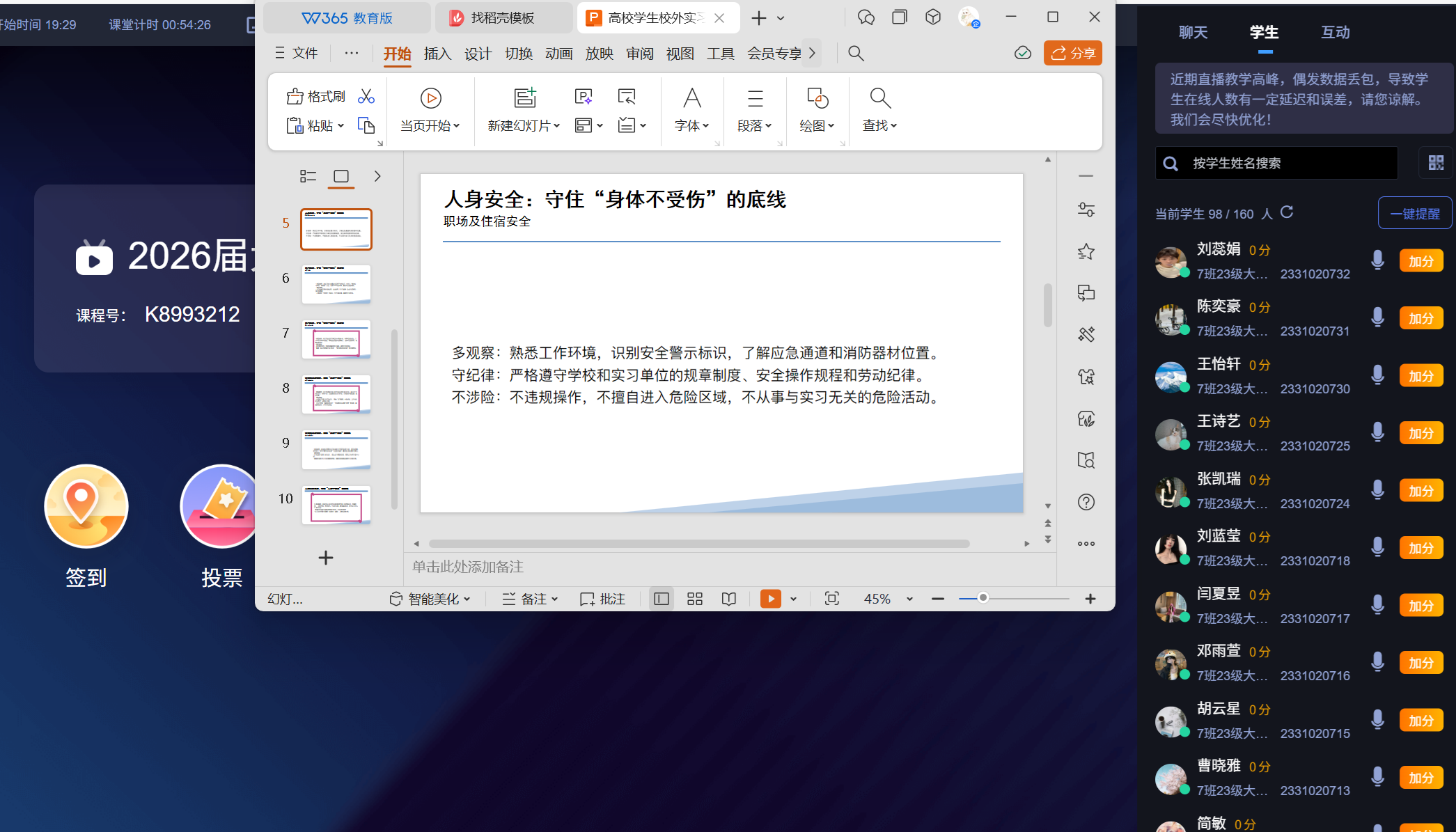 培训内容紧扣实习全过程,覆盖了网络安全、心理健康、交通安全、应急自救等核心模块。各班级指导教师不仅深入解读了实习管理“二十七严禁”行为红线,更结合学生未来职场环境中可能面临的真实案例,通过视频教学、在线互动等多种形式,将抽象的安全规范转化为生动、可操作的行动指南。特别是针对实习期间可能遇到的紧急情况,老师们还特别强调了应急处理流程和自救互救技能,帮助学生们更好地理解和掌握。