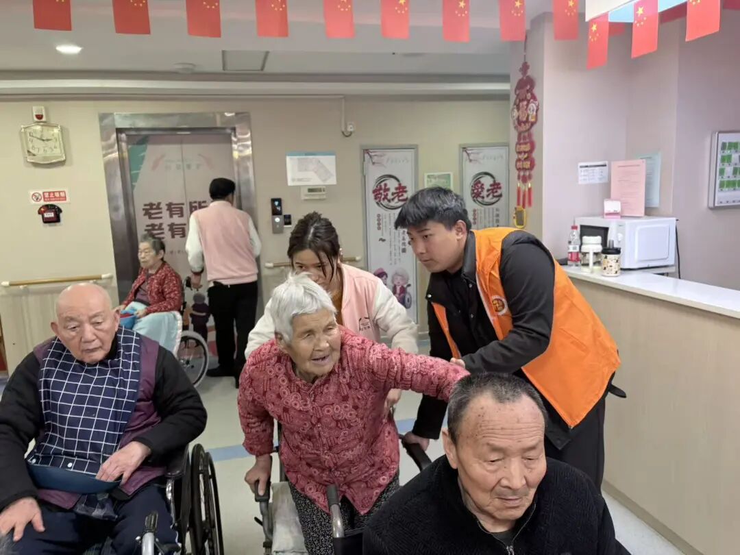 活动开始前,志愿者分组行动:搬桌椅、拉彩带、调音响,把平日安静的活动室装扮得年味十足。他们俯身搀扶老人入座,贴心地在每一张椅子上放好棉垫,并递上热茶,与老人拉家常、询寒暖,现场很快洋溢起“祖孙”般的亲切氛围。