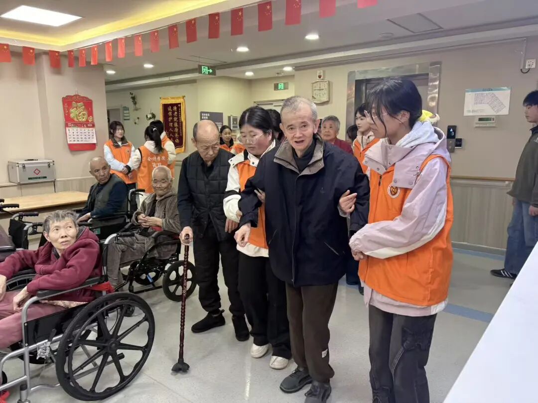 演出结束,志愿者搀老人回房、整理场地,并把写有祝福的“福”字贴到每扇房门。离别时,78岁的张爷爷拉着学生的手说:“今天像过年,你们一定要常回来!”