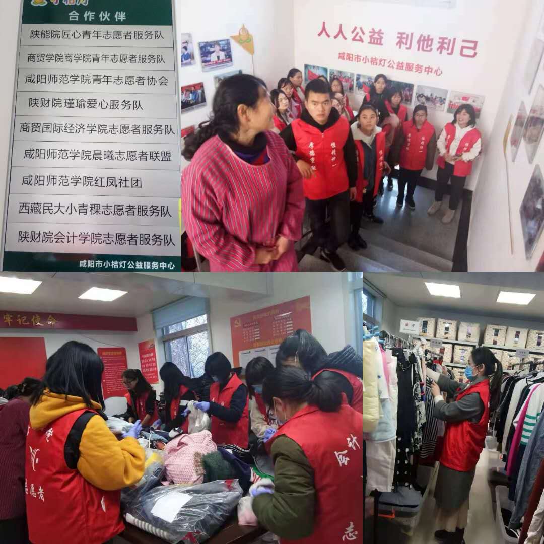 常驻志愿者董莉老师对同学们的到来表示热烈欢迎,并给同学们介绍了小桔灯公益服务中心的情况:咸阳市小桔灯公益服务中心由国网咸阳供电公司数名员工发起、经咸阳市民政局审核批准并正式登记注册的从事非营利性社会服务活动的民办慈善公益类社会组织。中心以“奉献、友爱、互助、进步”的志愿者精神,搭建爱心平台,承担社会责任,推进慈善服务,构建美好社会为宗旨。中心的主要业务范围是:策划组织闲置物品回收再利用、义卖、募捐;开展慈善救助、助学、助老等;公益宣传、志愿者招募及培训等一切有利于社会的公益慈善志愿服务活动。宣讲结束后同学们分成了分拣组、消毒组、衣橱组、运输组4个大组,在2个小时的志愿活动中,大家相互配合,分工合作,有条不紊,紧张有序的完成了志愿工作。