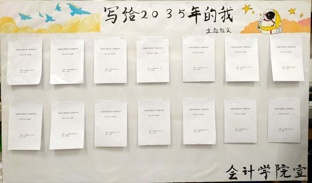 在“写给 2035 年的我”征文活动中,我院学子学生积极参与,踊跃投稿,共收集300于份书信作品。经我院团总支严格评选后,将30余份优秀作品进行了展示。信中我院学子用笔写下了时代青年的责任和担当,文字间尽显对实现中国梦的坚定信心,能从所学专业出发多方面认识自我,畅想科技引领时代发展,情感真挚,全面深刻,紧扣“技能成才强国有我”的活动主题。