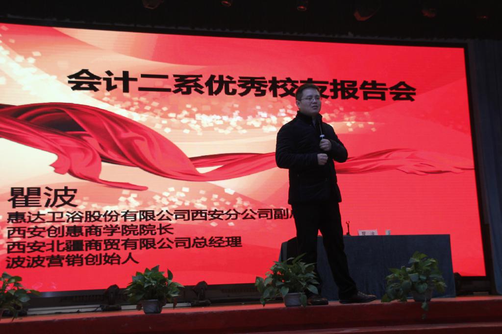 瞿波,男,2005届毕业生,在校期间曾任学生会干部,班长。现任惠达卫浴股份有限公司西安分公司副总裁、西安创惠商学院院长、西安北疆商贸有限公司总经理 、波波营销创始人。